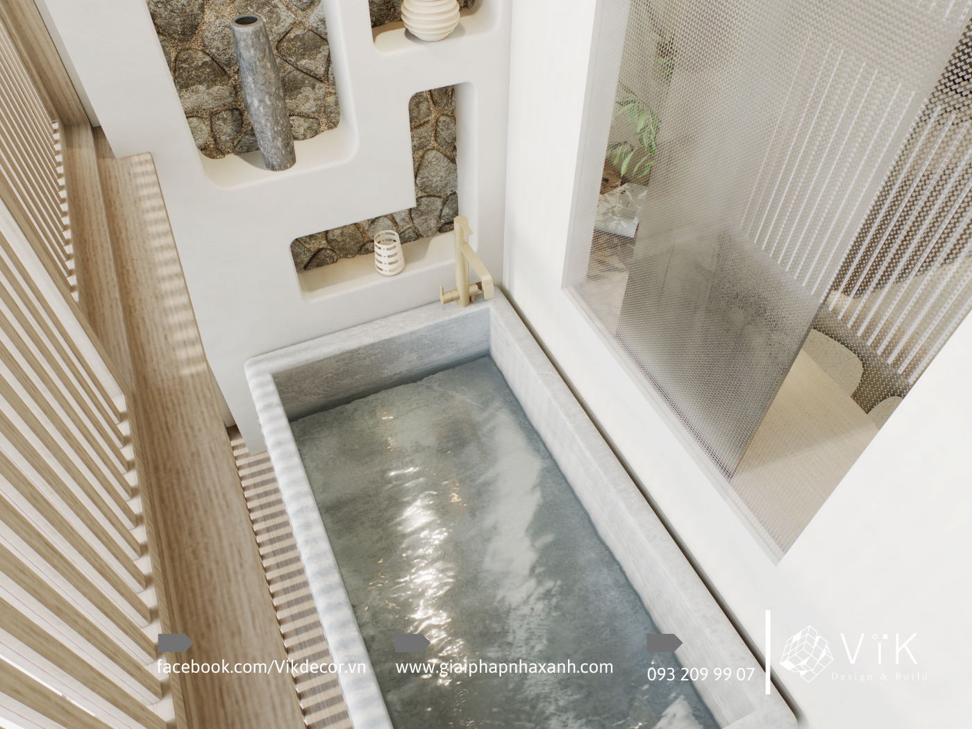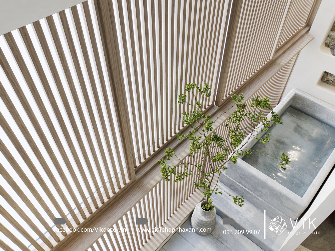 Một trong những điểm nổi bật của dự án chính là thiết kế giếng trời và ban công xanh. Giếng trời được tận dụng tối đa để lấy sáng và thông gió tự nhiên. Mảng tường trắng được khoét ô trang trí, ốp đá tự nhiên và bố trí cây xanh, tạo nên điểm nhấn độc đáo. Chậu cây đặt trong bồn xi măng lớn vươn cao dưới ánh sáng tự nhiên, mang đến sự cân bằng và gần gũi với thiên nhiên. Ban công phủ đầy cây xanh, lam gỗ ngang che nắng kết hợp với ánh sáng tự nhiên tạo ra một không gian nghỉ ngơi lý tưởng. Đây là nơi gia chủ có thể ngồi thưởng trà, đọc sách và tận hưởng sự yên bình.