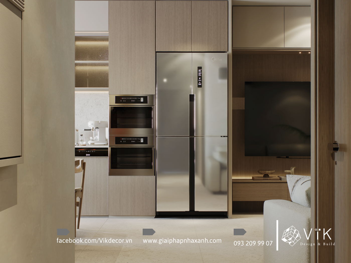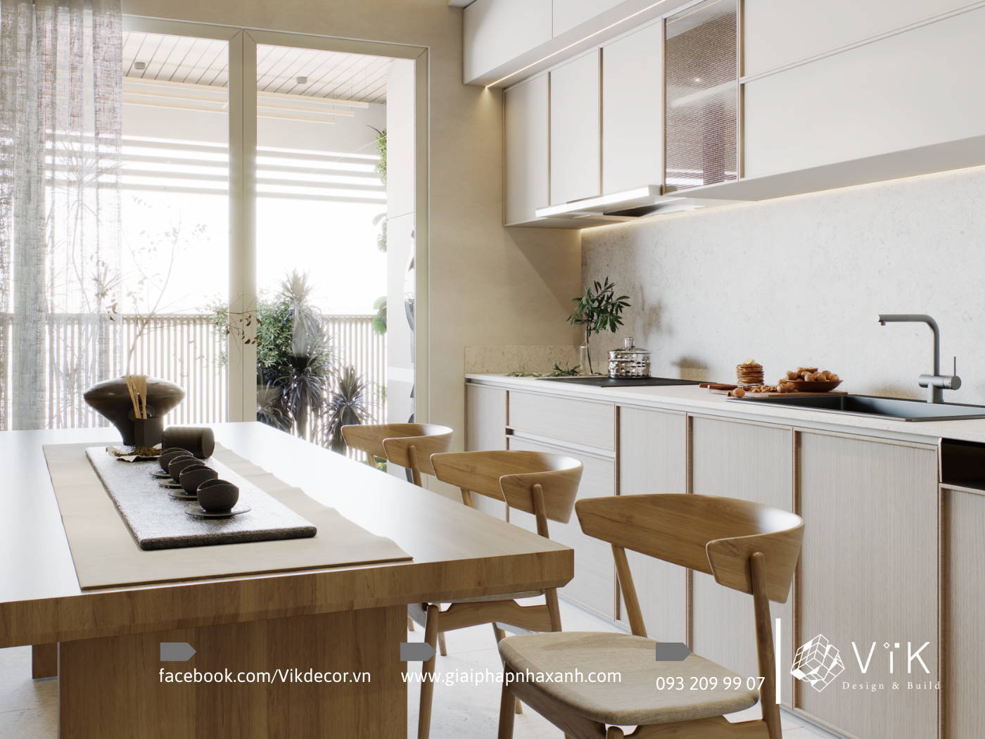 Khu bếp và bàn ăn được thiết kế mở, liền kề phòng khách nhằm tạo nên sự liên thông không gian. Tủ bếp bằng gỗ công nghiệp màu sáng, kết hợp bề mặt ốp đá trắng, giúp gian bếp luôn sạch sẽ và hiện đại. Các thiết bị điện tử như tủ lạnh inox, lò nướng, lò vi sóng đều được bố trí âm tường, tiết kiệm diện tích và mang tính thẩm mỹ cao. Bàn ăn dài bằng gỗ tự nhiên, đủ cho sáu người, được trang trí bằng bộ trà cụ cùng bình gốm tối giản, mang đậm tinh thần thiền của phong cách Japandi. Ánh sáng tự nhiên từ cửa kính lớn ban công phủ xuống, khiến mỗi bữa ăn gia đình trở nên ấm áp và dễ chịu.