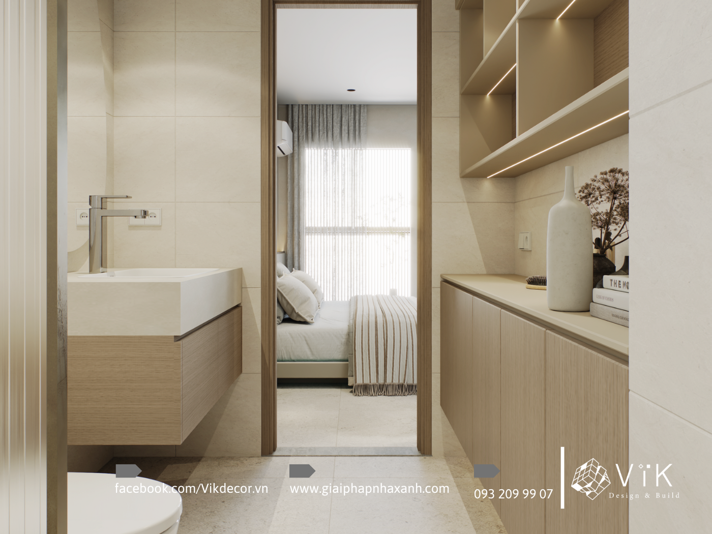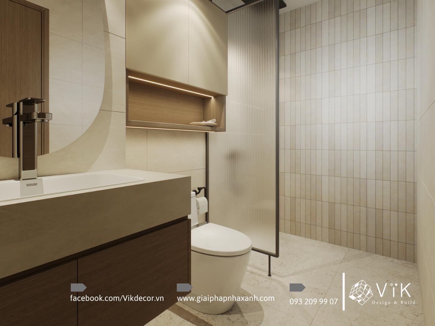 Khu vực vệ sinh của căn hộ được thiết kế tối giản nhưng tiện nghi. Tường và sàn ốp gạch màu sáng tạo cảm giác sạch sẽ và rộng rãi. Lavabo vuông vắn đặt trên tủ gỗ treo tường gọn gàng. Vách ngăn kính mờ phân chia khu vực tắm và vệ sinh, giữ không gian khô ráo và tiện lợi. Hệ thống ánh sáng vàng dịu được bố trí khéo léo, mang đến sự ấm áp, thư giãn như ở một khách sạn cao cấp. Đây là không gian nhỏ nhưng vẫn giữ được tinh thần Japandi với sự gọn gàng, hài hòa và thoải mái.