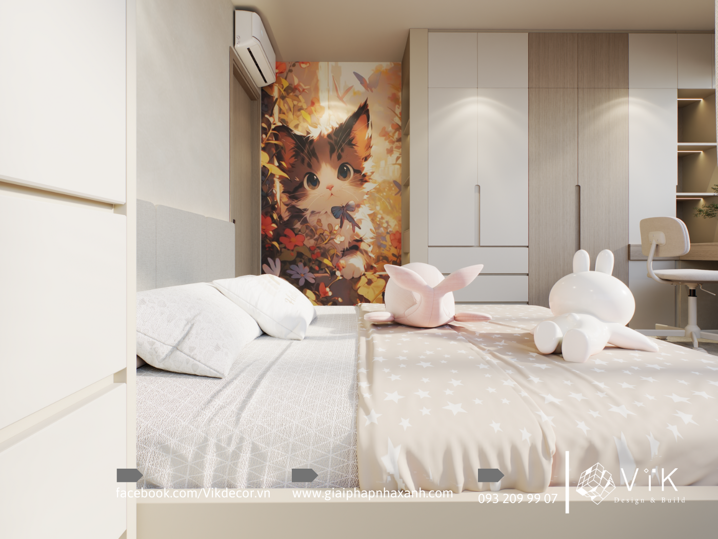 Phòng ngủ trẻ em trong dự án Cải Tạo Nội Thất Căn Hộ DIC Phoenix Vũng Tàu được thiết kế với tông màu trắng và be chủ đạo. Giường đôi thấp đảm bảo an toàn, ga trải giường in hình ngôi sao nhỏ cùng thú bông ngộ nghĩnh tạo cảm giác gần gũi và vui nhộn. Điểm nhấn nổi bật chính là bức tường tranh mèo hoạt hình khổ lớn, vừa đáng yêu vừa kích thích trí tưởng tượng của trẻ. Góc học tập được thiết kế thông minh, bàn học kéo dài sát cửa sổ, tận dụng ánh sáng tự nhiên. Hệ tủ quần áo âm tường và kệ mở đảm bảo gọn gàng, tạo điều kiện để trẻ học tập và sáng tạo trong không gian thoáng đãng.