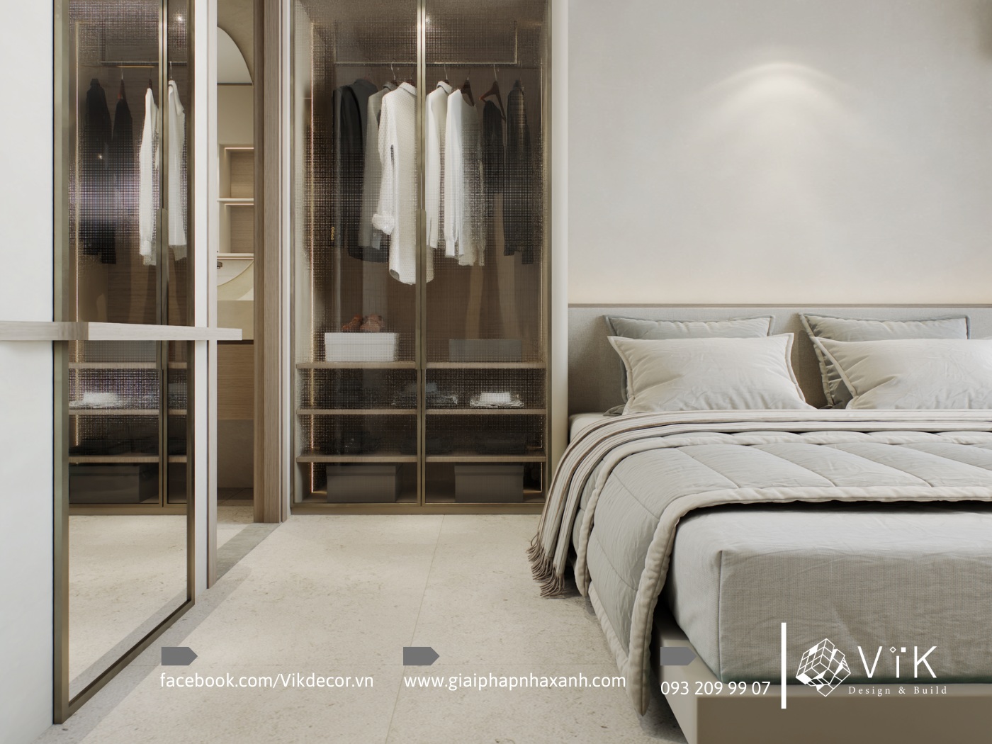 Phòng ngủ master mang tinh thần Japandi rõ nét với giường lớn có đầu giường bọc nệm sáng màu, đem lại cảm giác êm ái và thư giãn. Tủ quần áo cánh kính mờ kết hợp viền kim loại sang trọng, bên trong có hệ đèn led âm tạo hiệu ứng hiện đại. Góc bàn trang điểm nhỏ gọn với gương vòm cao, ghế đôn bọc da kem cùng lọ hoa decor tối giản tạo thành một góc thiền nhẹ nhàng. Đối diện giường ngủ là kệ TV treo tường kết hợp kệ gỗ thấp vừa tiện lợi vừa thẩm mỹ. Cửa kính lớn phủ rèm voan trắng mở ra ban công xanh mát, ánh sáng tự nhiên tràn ngập, giúp không gian nghỉ ngơi trở nên thư thái và trong lành hơn.