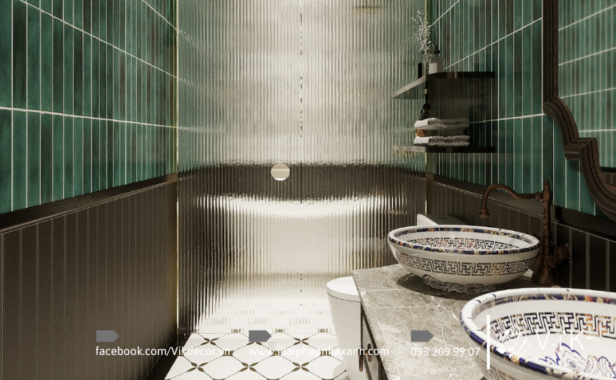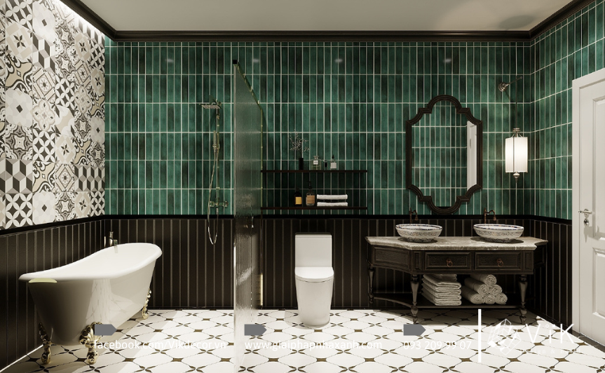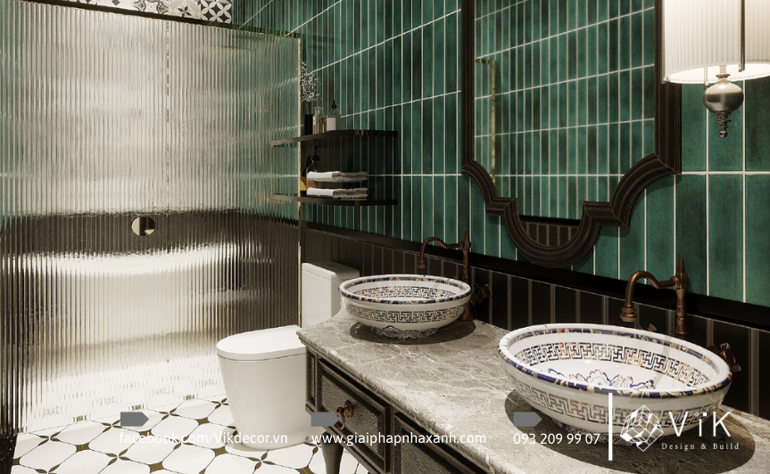 Không gian phòng tắm cũng được đầu tư mạnh mẽ trong dự án này. Một số phòng sử dụng gạch ốp sáng màu, lavabo hiện đại, gương led chống mờ mang hơi thở hiện đại. Một số khác lại gây ấn tượng bằng gạch xanh ngọc, lavabo gốm hoa văn, bồn tắm dáng cổ điển, tạo cảm giác như một khu spa thu nhỏ. Cách sắp đặt vật liệu và ánh sáng hợp lý đã biến nơi này trở thành góc thư giãn lý tưởng, giúp các thành viên gia đình xua tan mệt mỏi sau ngày dài.