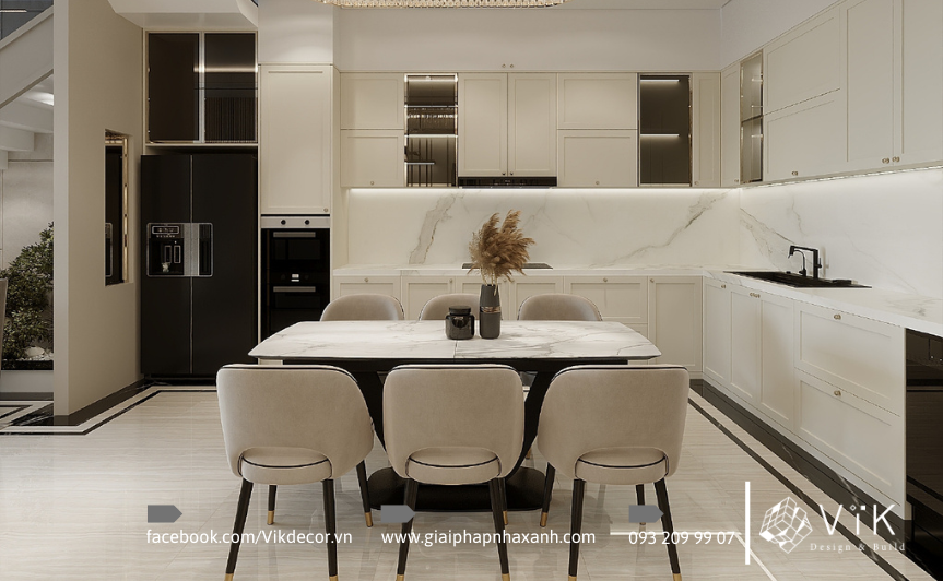 Một trong những hạng mục quan trọng khi cải tạo nhà phố là không gian bếp. Với diện tích 300m2, khu bếp của chị Ngân được thiết kế theo dạng chữ L rộng rãi. Tủ bếp đồng bộ màu trắng, mặt đá ốp bếp vân mây sang trọng, kết hợp cùng hệ thống tủ kịch trần tối ưu diện tích lưu trữ. Các thiết bị hiện đại như lò nướng, máy hút mùi, tủ lạnh lớn được bố trí âm tủ, tạo sự gọn gàng và tiện nghi.