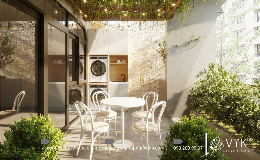 Điểm nhấn khác của công trình là ban công và sân vườn. Ban công được cải tạo với bàn tròn nhỏ và ghế trắng phong cách cổ điển, xung quanh phủ cây xanh. Phía trên treo giàn dây leo kết hợp hệ thống đèn thả, mang lại không khí lãng mạn và gần gũi thiên nhiên. Sân vườn nhỏ trước nhà được bố trí tiểu cảnh, cây xanh và ánh sáng hắt nhẹ, tạo nên khoảng nghỉ đầy thư giãn, giúp cân bằng nhịp sống đô thị.
